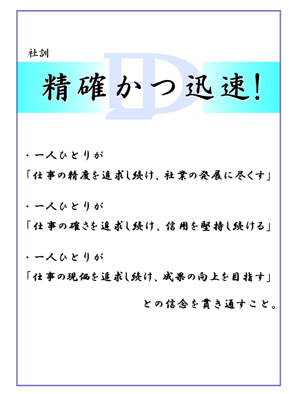 これからもこの精神を社業の中心に据え、地域社会から信頼され必要とされる企業であり続けることを目指し、より一層の技術力の向上と誠実な業務の遂行に努めてまいります。